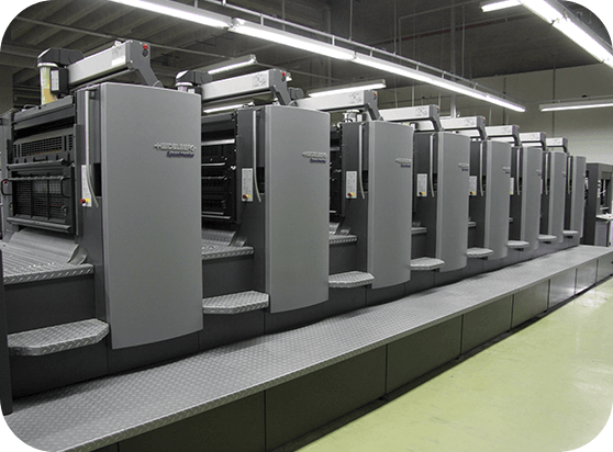 1 Heidelberg Speedmaster XL 105-5 de formato máximo de impressão 1050x750 mm, em 5 Cores com verniz base d´agua em linha.1 Heidelberg Speedmaster SM 102-2 de formato máximo de impressão 1020x720 mm, em 2 Cores + Reversão 1X1 cores.
